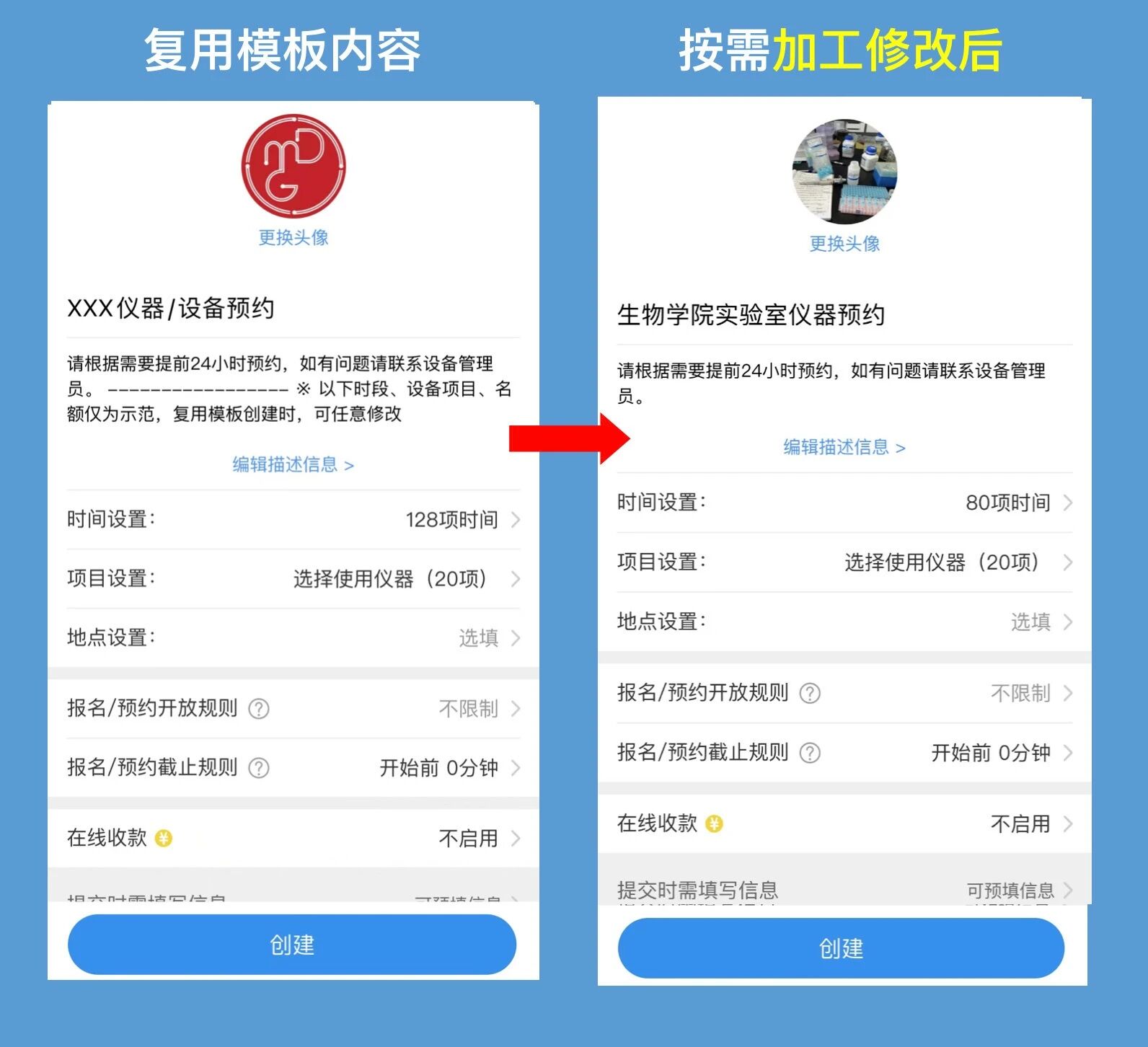 参照模板已有内容,按需进行修改和调整(比如展示信息、可约时段、仪器设备名称、提交信息等),不超3分钟,就可以完成配置并立即启用了。