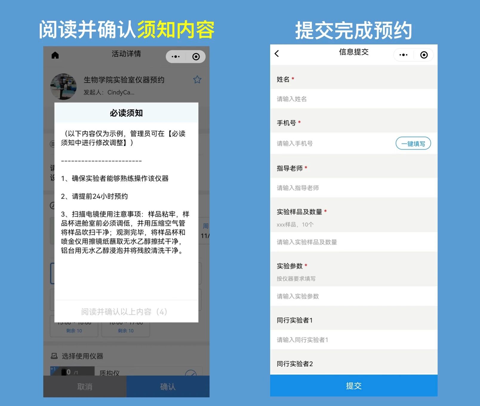 ② 预约&阅读须知:预约人选择需要借用的仪器和使用时间,阅读仪器借用须知,并填写预约信息,即可完成一次预约。