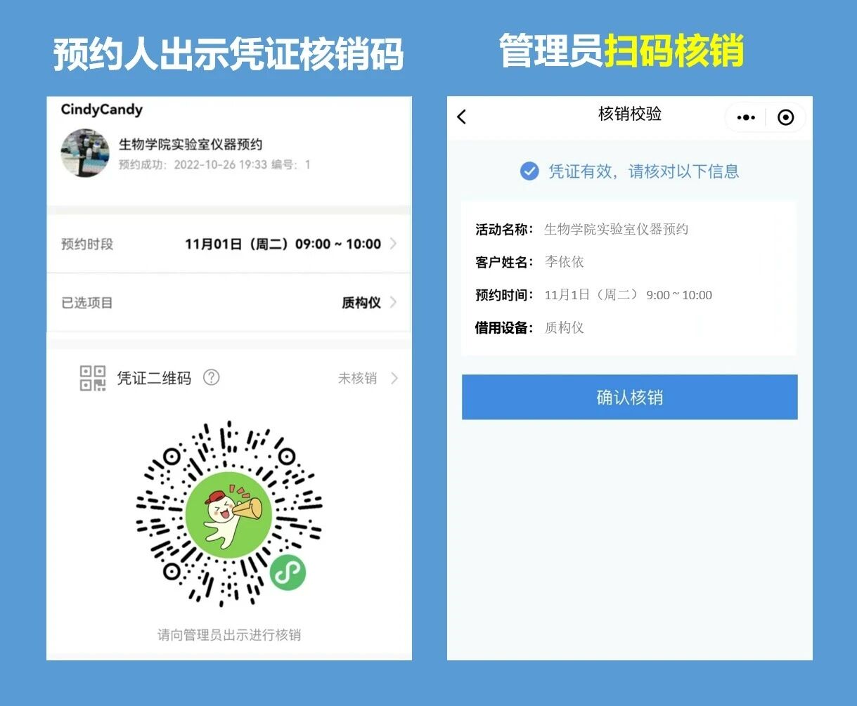 ⑤ 核销及领取使用:预约人凭预约后生成的预约码,与管理员在线下进行核对,即可完成预约,使用仪器(支持两种核销模式:1-管理员扫码核销、2-自助扫码核销,如要减少管理投入,可选用自助核销,借用人自助借还):