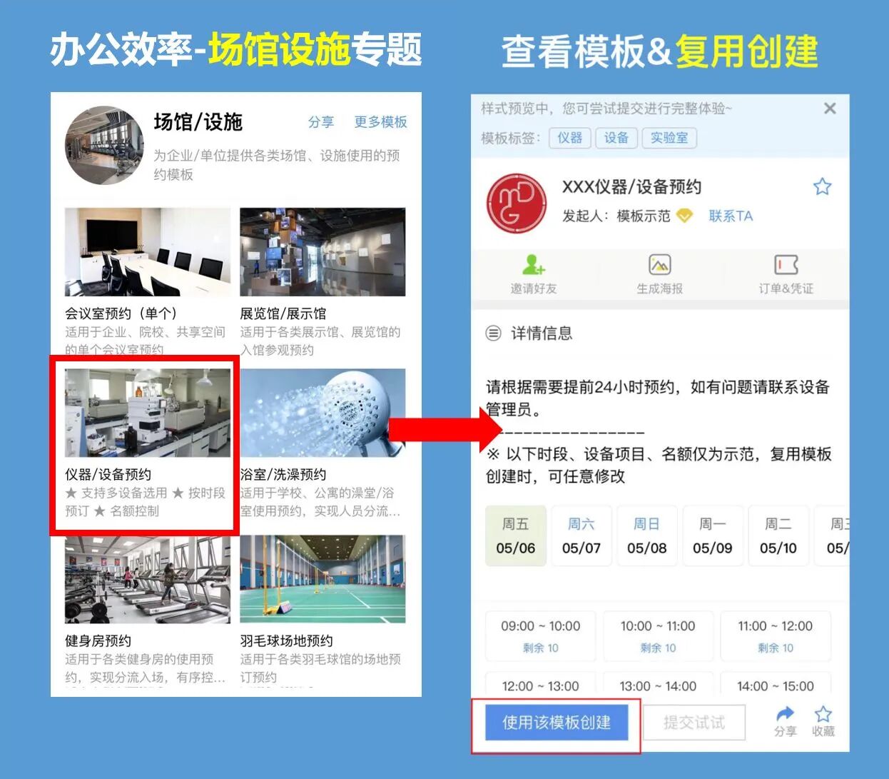 快预约基于多年预约系统构建服务的经验,结合大量客户实际运用中的需求与反馈,提炼出【仪器/设备预约】模板,复用需要的模板即可快速创建:
