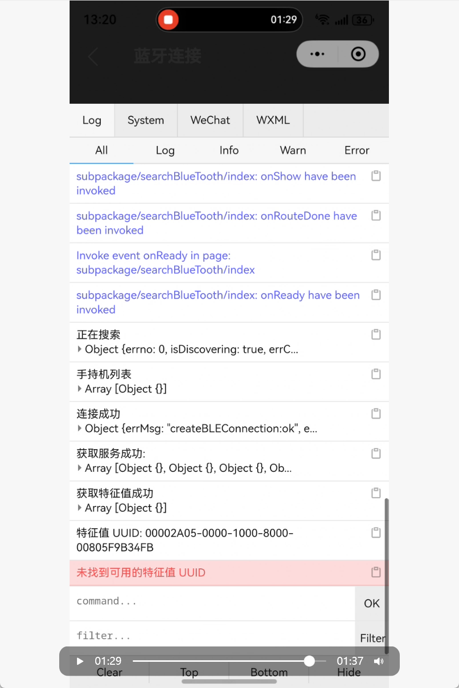 使用华为鸿蒙6.0版本的手机小程序调用蓝牙连接时一直获取不到想要的特征值,其他类型的手机和低版本的鸿蒙手机都是可以正常获取的,不知道是什么原因,一直找不到0000FFF6的特征值