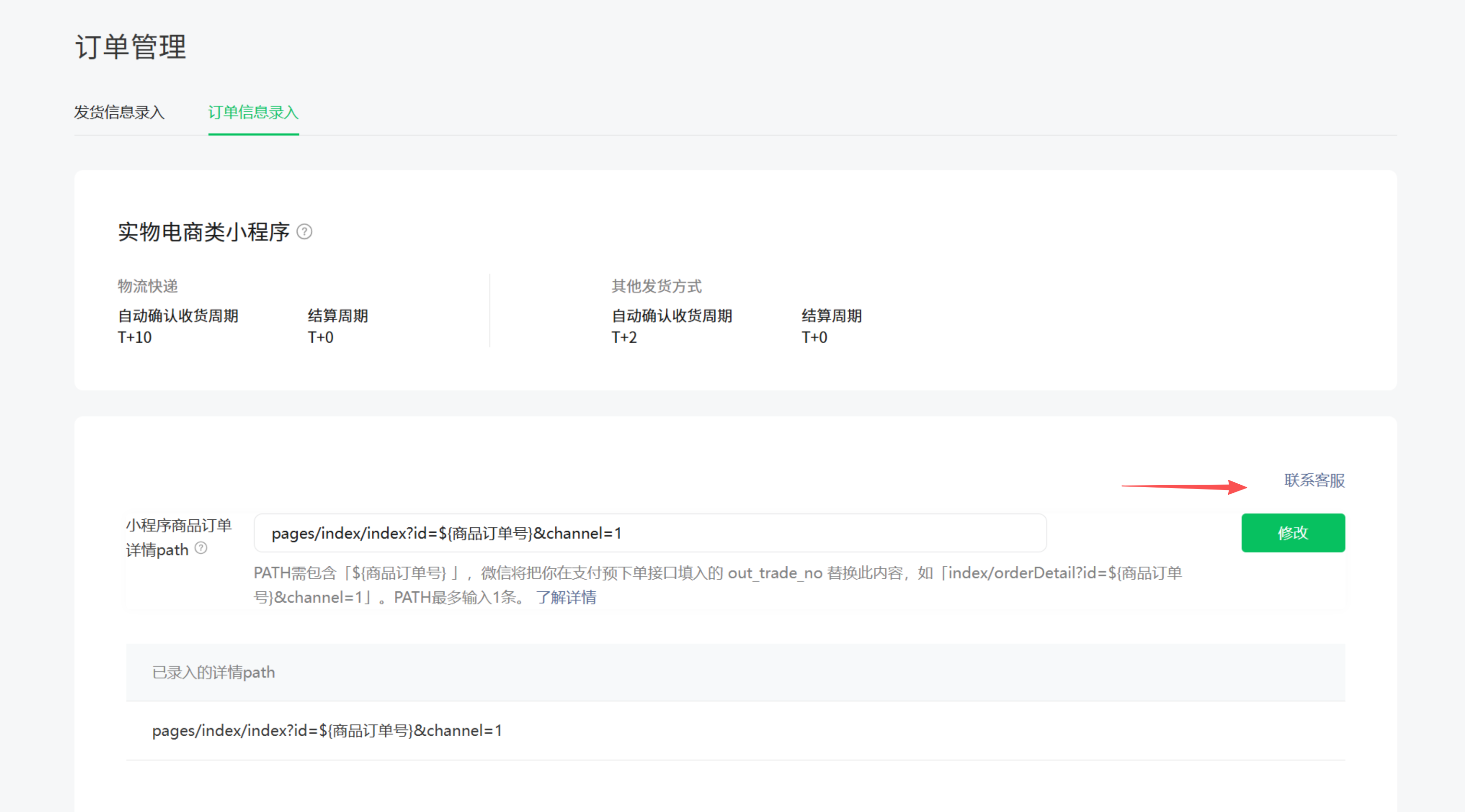 商家可在该路径进行咨询下哈,路径:小程序管理后台https://mp.weixin.qq.com/ 支付与交易-订单管理-订单信息录入-联系客服