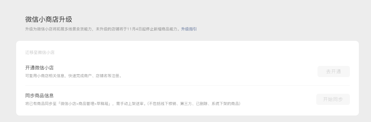 开通选项无法点击。目前通过其他渠道开通好了微信小店,但是商品内容无法迁移