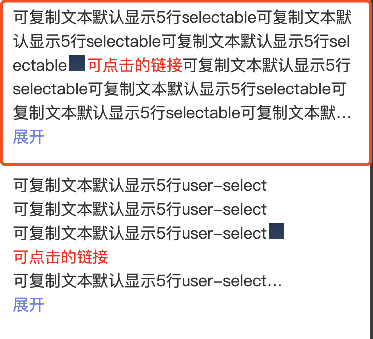 如下图红色框内是需要的效果,selectable改为user-select后就变成下面的效果了,代码片段:https://developers.weixin.qq.com/s/ZDDkJIm17bjf
