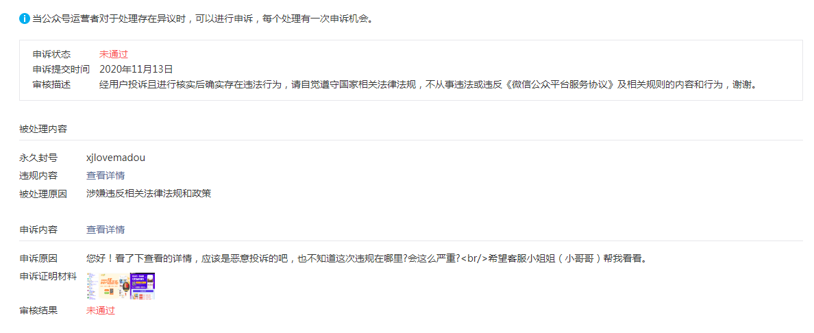 - 而截图的违规内容,被封禁内容如下图,查看详情页面如下,不知道哪里涉嫌违反了相关法律法规和政策。怀疑是同行恶意举报被误封 希望帮忙解决一下拜托了 或者至少是哪里违规了 也让我知道一下!