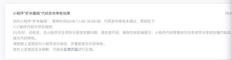 你好,经核实,贵方小程序确实涉及诱导分享朋友圈,涉及平台未允许的内容,请去掉该功能。请修改后再提交代码审核。(详见下图)![]()
