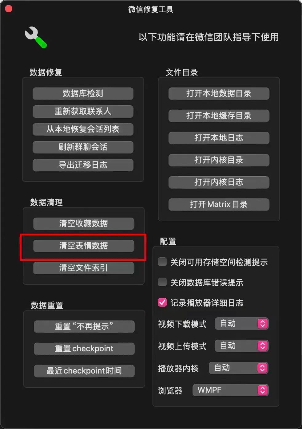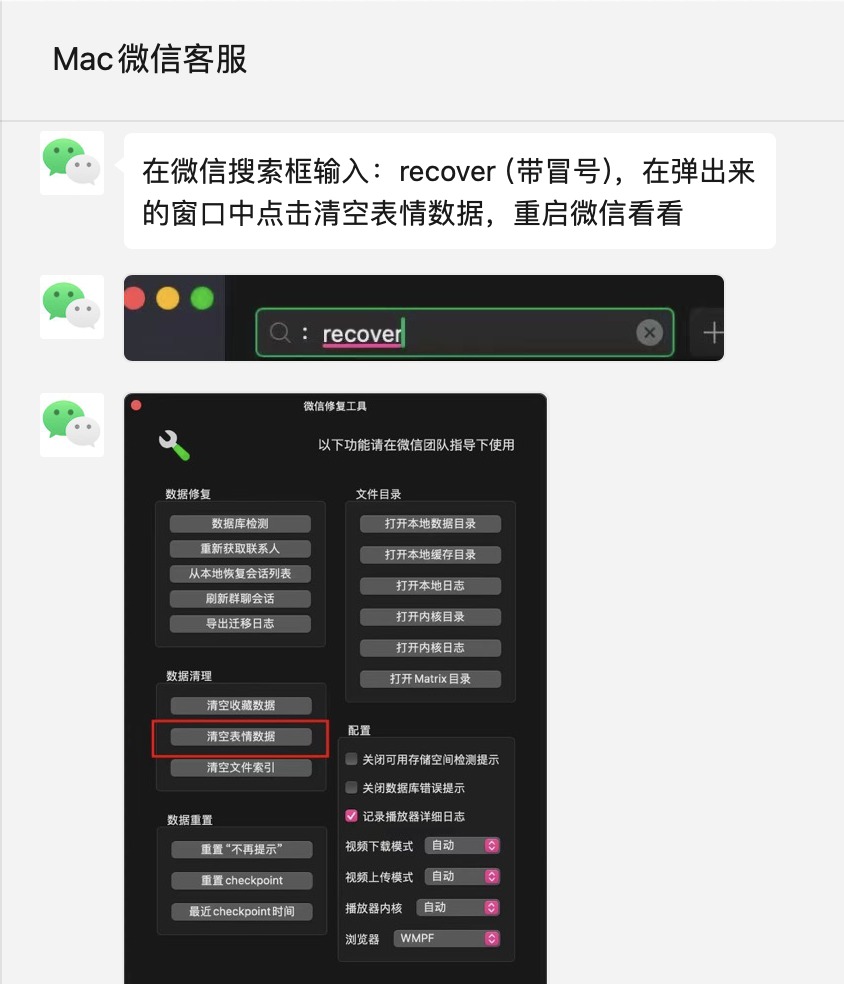 Mac微信客服给的回复,亲测Mac M1 Pro Sonoma 14.2可用。修复工具有风险,请自行斟酌判断,解决方法仅仅转发,不对产生后果(表情包丢失等)负责。