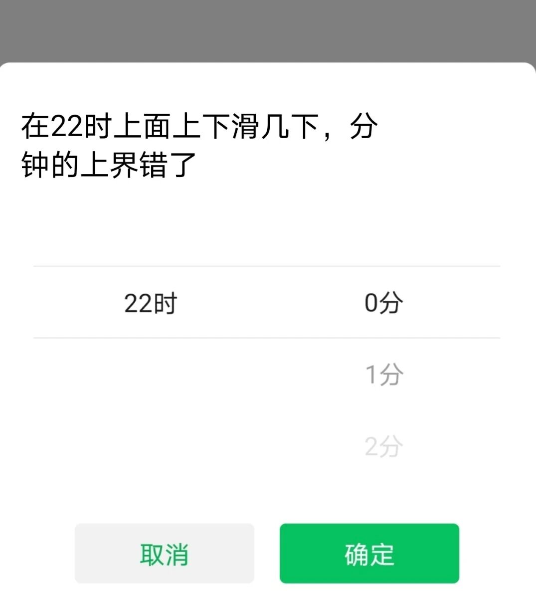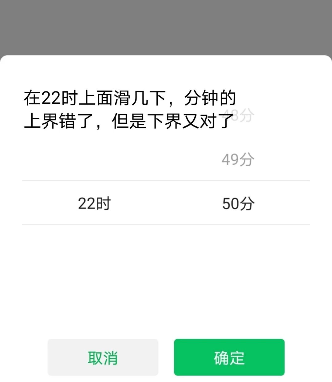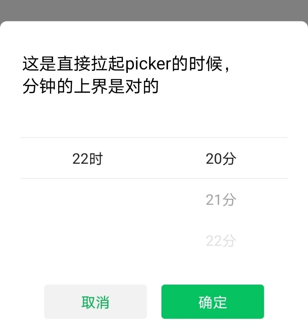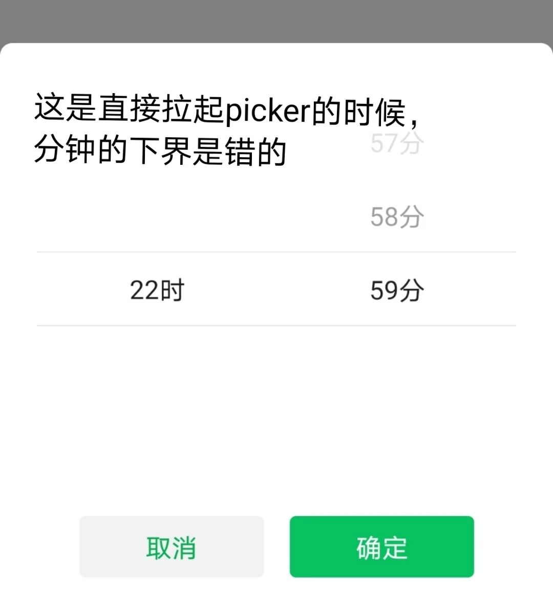 picker mode为time,当start和end是同一小时内的时间,如start为22:20,end为22:50,当你拉起picker的时候,这时候分钟列的上界是对的,即能从20分开始,但是下界是错的,不是到50,而是到59。此时,你在小时的那一列上胡乱上下滑几下,就会得到分钟列的上界错了,即不是从20开始,而是从0开始,但是下界又对了,能限制到50.