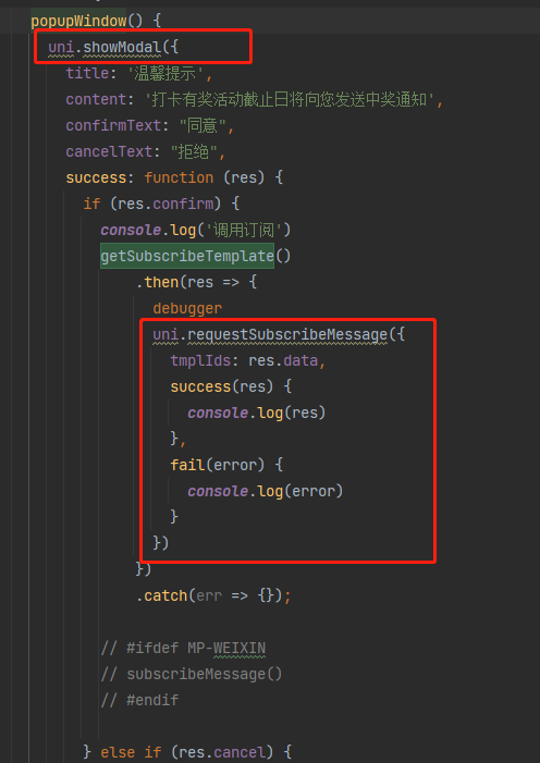 结贴:因模板key是后端提供的,故调用了后端的接口,如此一来就是异步,所以导致了报错;解决方法,可以先调用接口,再调用uni.showModal弹窗