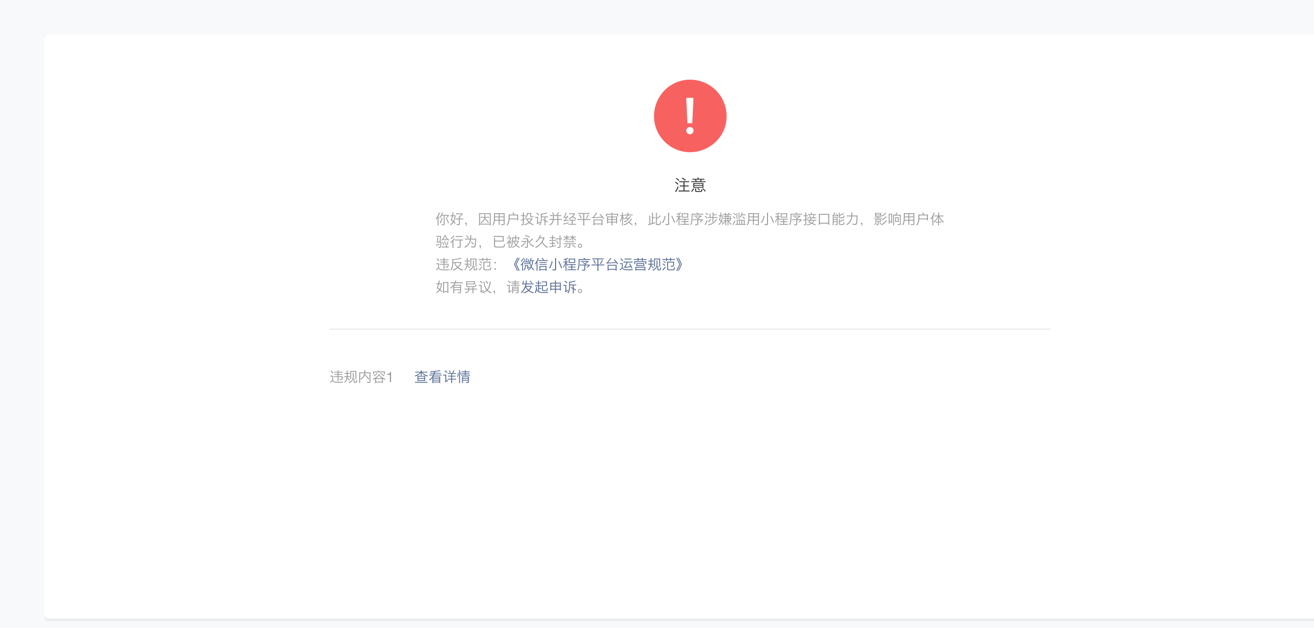 申诉过一次 反馈说是因为被举报了 希望官方能好好调查一下 不能因为竞争对手的举报就封了我们的小程序