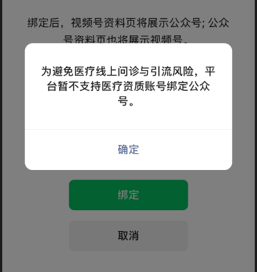 服务号原先是绑定视频号的,视频号认证掉了 重新认证后,服务号就绑不上视频号了 提示:为避免医疗线上问诊与引流风险,平台暂不支持医疗资质账号绑定公众号。但是之前是可以绑定的 而且其他家服务号也是正常绑定的,这个是怎么回事 怎么解决啊?