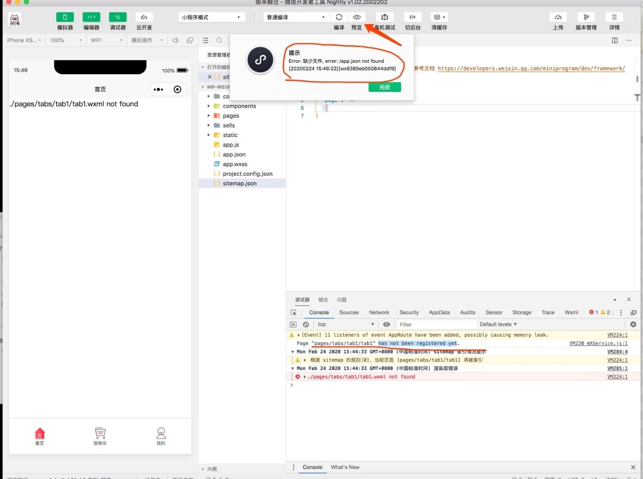 莫名其妙的错误,下面提示page /xx has not been registered yet,点击预览的时候提示没有app.json