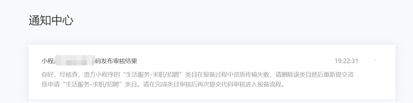 如图所示,我们小程序设置的服务类目为【社交-笔记】和【旅游服务-景区服务】,并没有设置过【生活服务-求职/招聘】的类目,为什么二审不通过的结果会出现一个我们没设置过的类目,请问是哪个流程出错,应该联系谁处理?