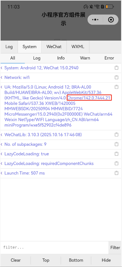 如果当前安卓微信 XWeb 142 内核版本遇到异常表现或者渲染相关的问题,可先查看 UserAgent 版本是否包含 Chrome/142.0.x.x 来判断是否为 142 新内核,并在 小程序交流专区 发布标题含「安卓微信 XWeb 142 新内核」的帖子进行反馈。