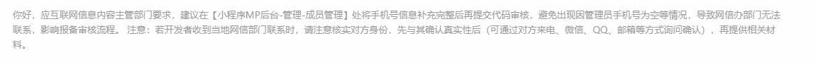 ,建议在【小程序MP后台-管理-成员管理】处将手机号信息补充完整后再提交代码审核