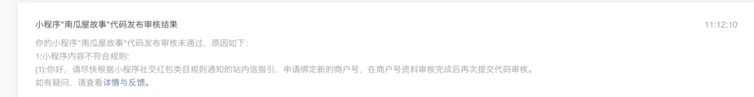 我们的小程序里面涉及打赏功能,之前按照规定已经申请了“社交红包”类目并且已经通过审核,后来提交代码审核再没有提及这个问题,但是最近的这次提交被退回,让重新绑定新的商户号,是怎么回事?不太合理吧。。。。