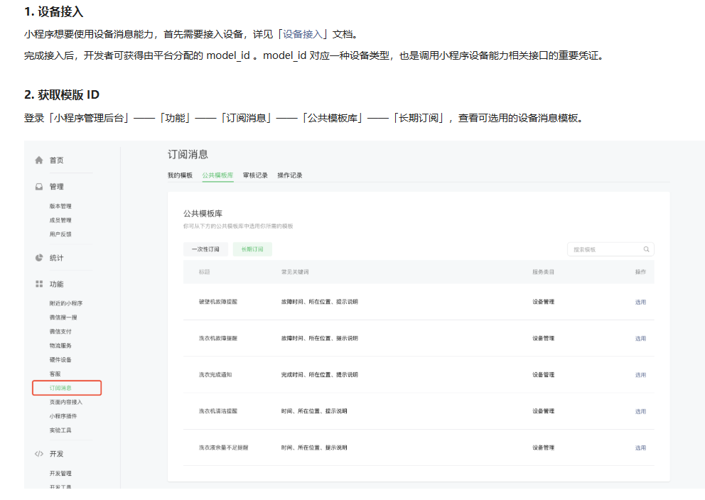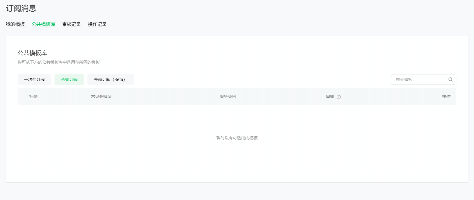 你好,长期订阅消息目前只对政务民生、医疗、交通、金融、教育、设备等部分二级行业类目进行开放,目前只支持少量民生公共服务节点通知,并非所有场景都支持。长期订阅模板库有模板可以进行调用,没有模板说明暂时不支持;长期订阅无法自定义模板,如符合以上开放类目,需要新增长期订阅模板,请按以下格式填写相关信息帮助评估;