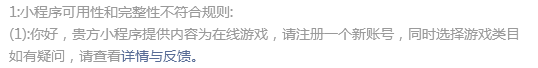 提交审核多次,一直说是在线游戏,其实我本意不是做游戏的(本意上是做个小程序,让大家可以送送花,聊天之余可以进入小程序通过送花培养下感情),一直也有对本次更新内容做删减(或删除或屏蔽),还是不给过,现在都删到和线上版本一样了,实在不知道怎么搞了。