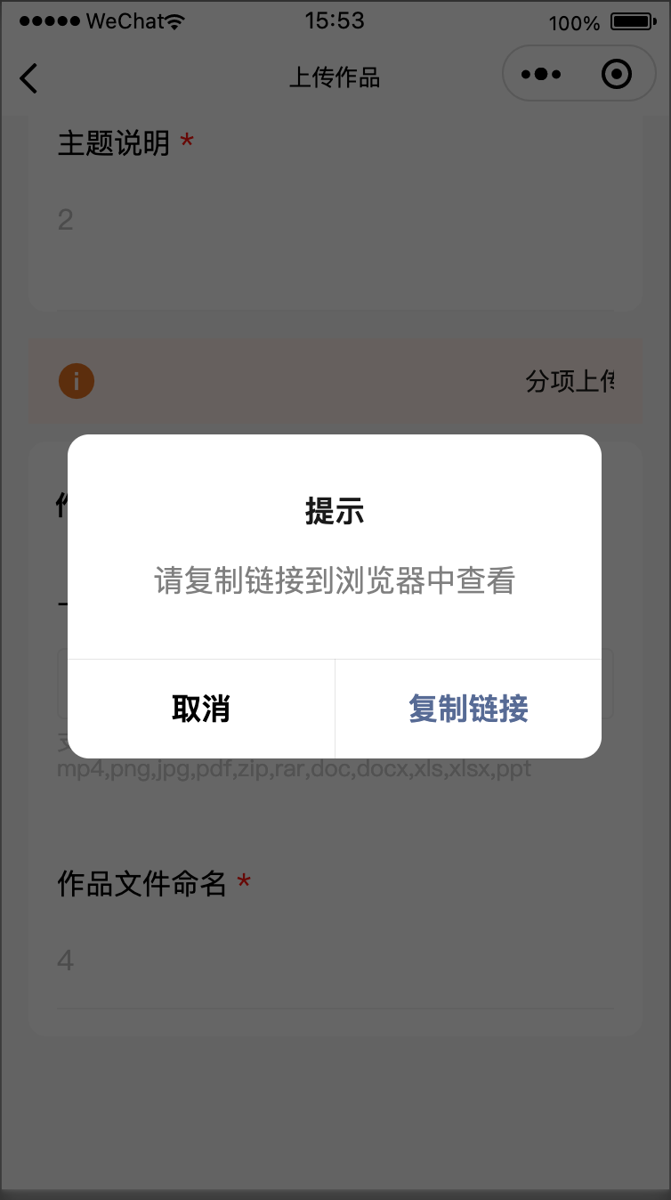 wx.showModal({ title: '提示', content: '请复制链接到浏览器中查看', cancelText: '取消', confirmText: '复制链接', success(res) { if (res.confirm) { wx.setClipboardData({ data: fileUrl, // url地址 success(res) {} }); } } })