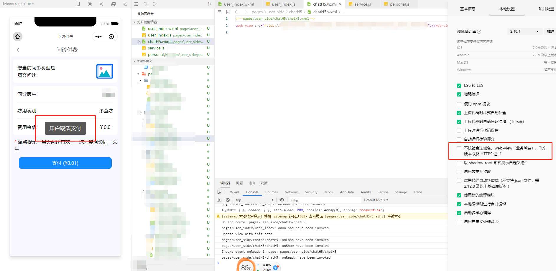 当体验版打开调试和真机调试不校验域名的时候,点击支付,第一次会依旧提示"此场景无法调起支付!"的提示,之后再次点击的时候却都能成功调起支付: