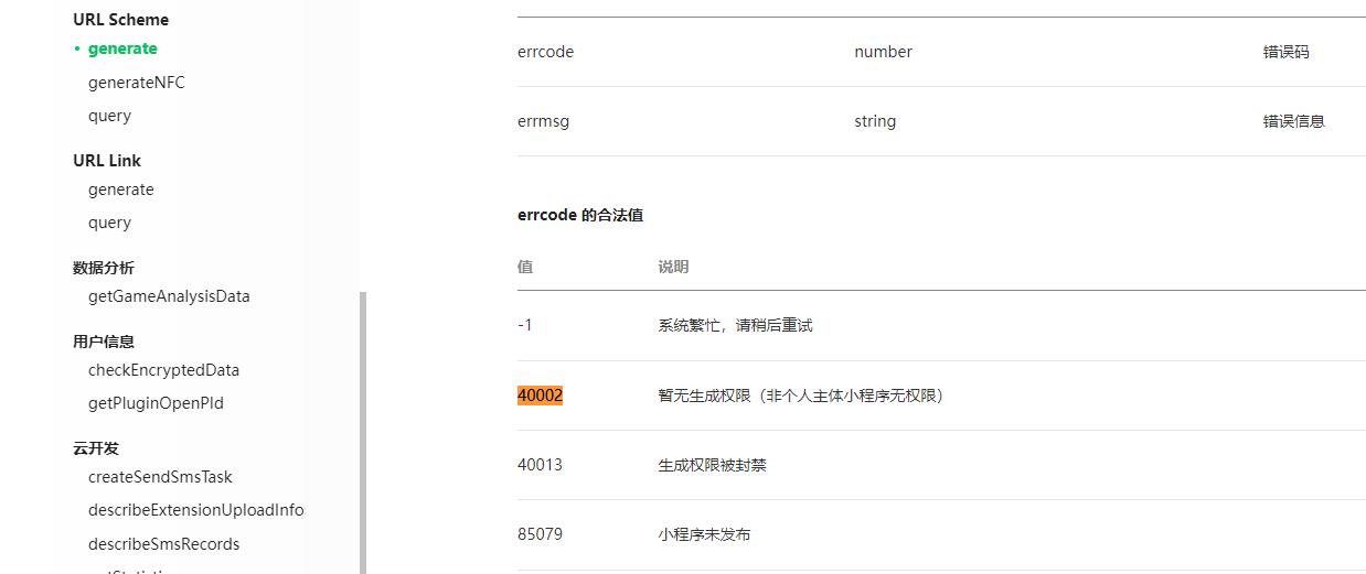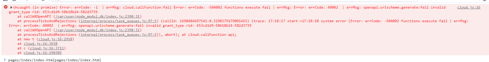 errMsg: cloud.callFunction:fail Error: errCode: -504002 functions execute fail | errMsg: Error: errCode: 40002 | errMsg: openapi.urlscheme.generate:fail invalid grant_type rid: 653cd1d9-58b18b24-582d3739