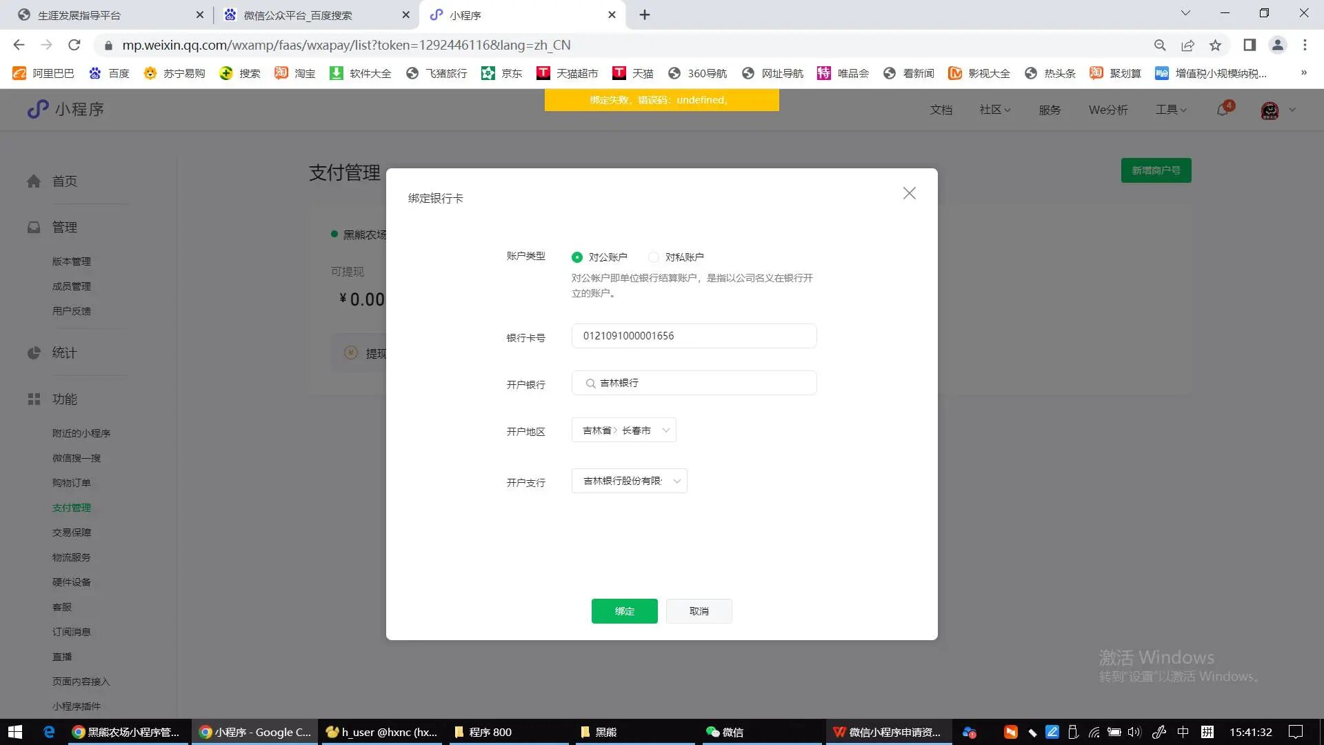 小程序—支付管理,绑定银行卡号,提示”绑定失败,错误码undefined“。输入的银行卡号和选择的分行都没错误。