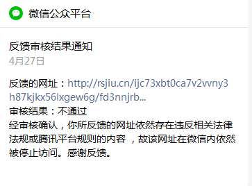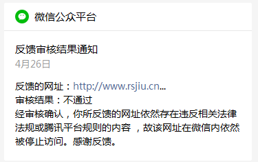 我新注册的域名 rsjiu.cn 居然被微信拦截了?多次提交申诉,审核结果都是不通过?麻烦哪位大神帮忙看看怎么处理才行?