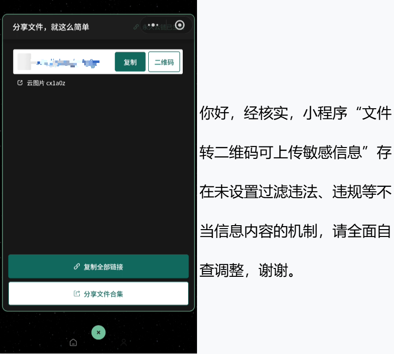 理解了,目前的二维码生成、小程序分享可能仍然能够分享审核中的文件,知晓整改方向了。