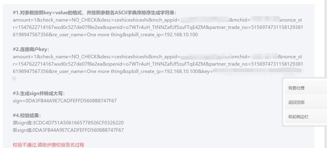 1)你签名中的key,也就是你的API密钥key,这个参数要你们自己到商户平台设置的,设置的规则是32位数字与字母大小写的组合的随机数,不能设置成签名串和参数appsecret,你们有正确设置吗???