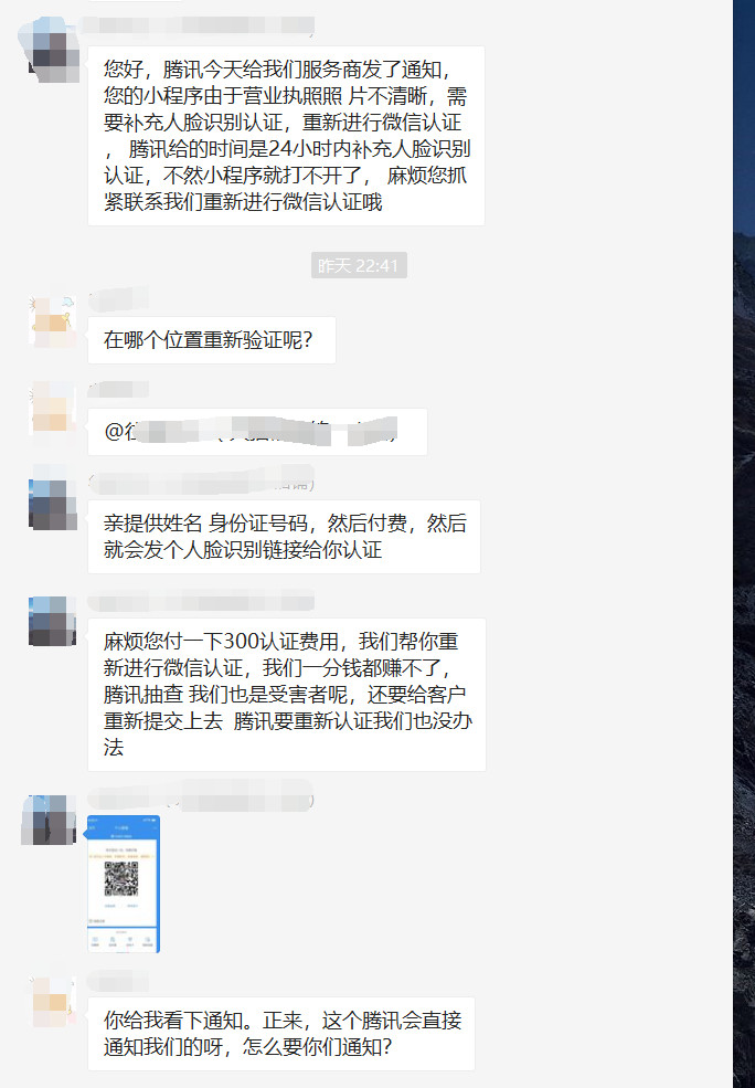 各位好,如下图所示,我们在淘宝购买的小程序,现在小程序服务商要求我们交300费用进行微信认证,我们是不是被坑了?
