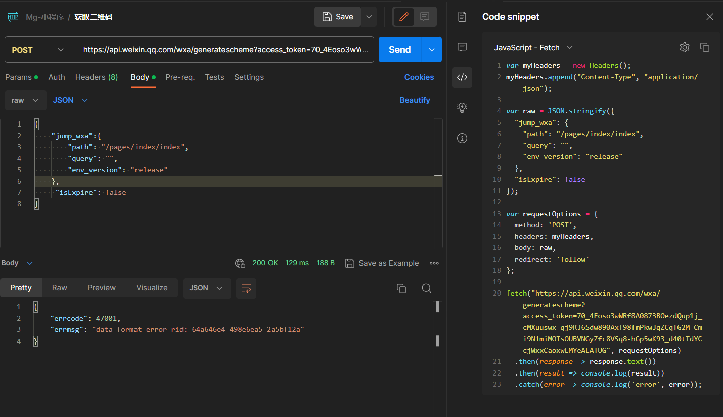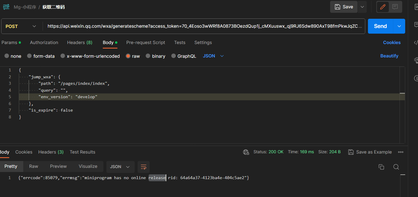 调用https://api.weixin.qq.com/wxa/generatesch postman接口报错,能bu'nebune哪个帮忙看下什么原因导致的