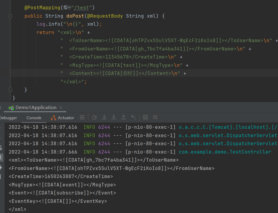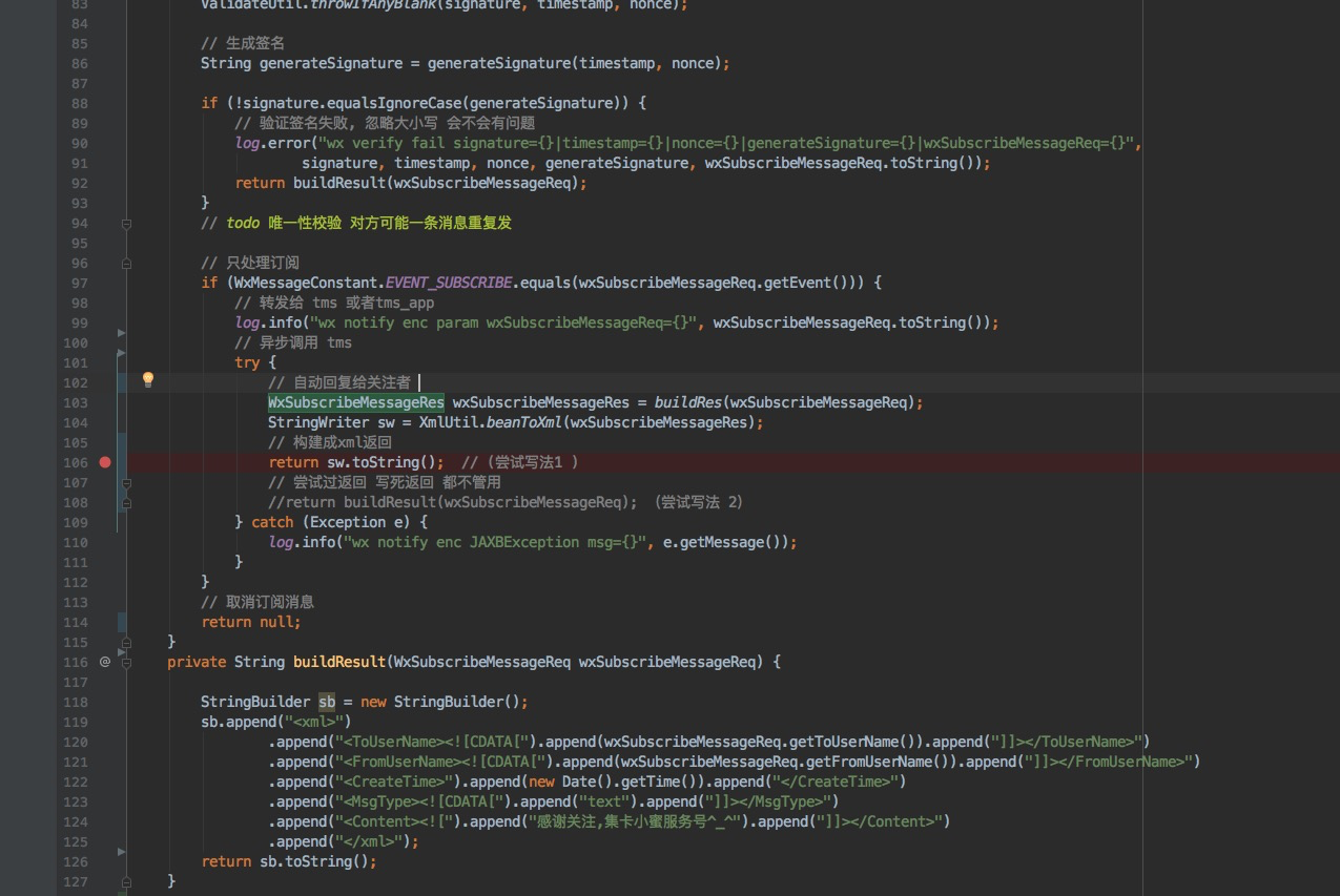 问题: 签名正常, 订阅接口能正常收到关注后的通知, 但是自动回复关注者, 用户收不到服务 发给他的文本信息, 后端服务响应 代码如下