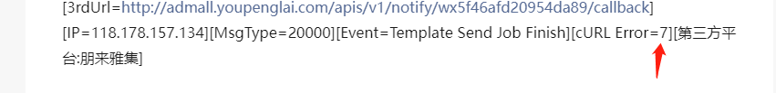 错误样例: [OpenID=ondrFweUheEyzJ0tbXRg2DuPSzWU][Stamp=1664711284][OuterIP=175.24.214.222][3rdUrl=http://admall.youpenglai.com/apis/v1/notify/wx5f46afd20954da89/callback][IP=118.178.157.134][MsgType=20000][Event=Template Send Job Finish][cURL Error=7][第三方平台:朋来雅集]