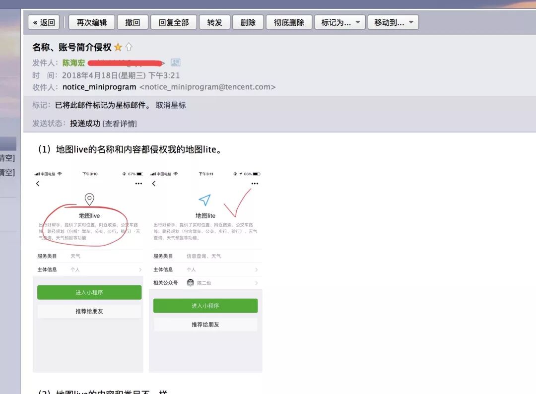 这是我昨天发的投诉地图live的邮件,反而,怎么导致我开发的小程序地图lite无法用“地图”关键字搜索了。