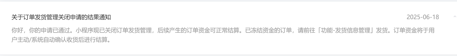 目前暂不支持关闭订单发货管理,核实目前小程序已提交过修改交易类型的申请,且修改成功。当前小程序可无需上传发货信息,当小程序产生新的交易订单时,会自动跳过发货环节,订单状态将直接流转为【已完成待结算】,订单会在交易成功后的第2天(T+2),由系统自动结算。