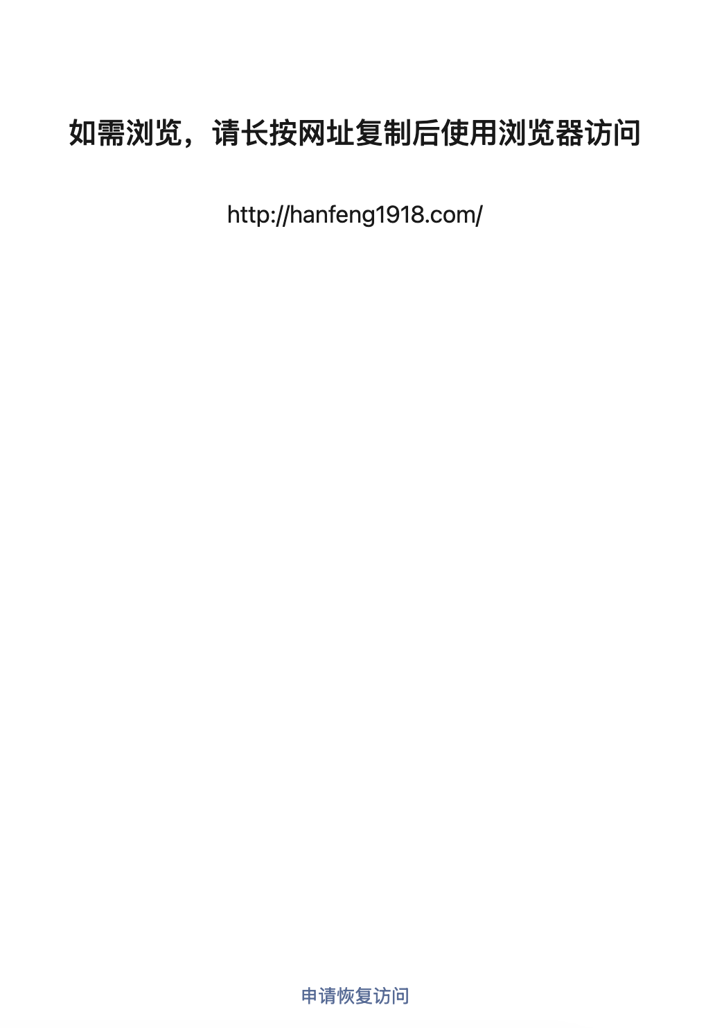 http://hanfeng1918.com,域名并未违规,但是在微信内无法直接访问,需要能恢复直接访问