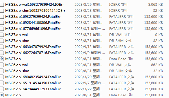 (3) 另外还有就是没有MSG8.db文件,全是MSG8.db损坏文件,大小一样。导致我2023年8月每天的聊天记录都无法保存,每次关闭PC微信后重新打开,前一天的聊天记录也消失。这是什么原因造成的,该怎么处理?