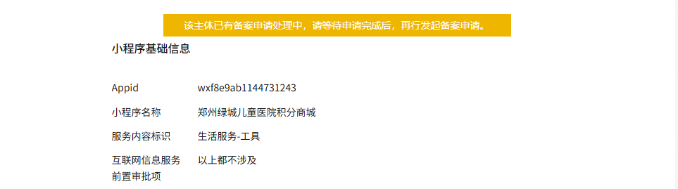之前审核反馈说主体公司的营业执照边角不够完整,我这边补充后再提交就出现这种情况了,已经有半个多月了,期间也查询了我们这个申请的主体名下没有在申请中的备案啊,到底是怎么回事?返回主界面就是绿色按钮“去备案”,然后进去提交就是图1这种情况。