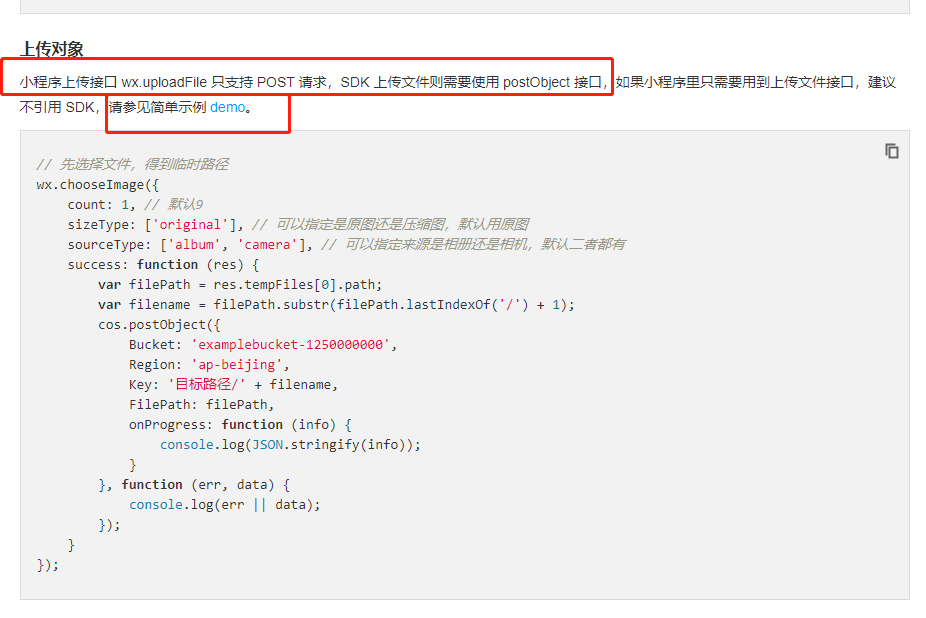 这里有写到如何配置域名。COS是可以在小程序端直接上传的。