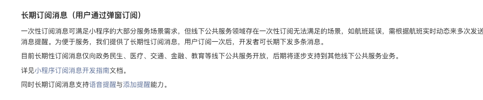 你好,长期订阅消息目前只对政务民生、医疗、交通、金融、教育、设备等部分二级行业类目进行开放,仅支持少量民生公共服务节点通知,并非所有场景都能支持,请谅解。如有新增长期订阅模板需求,可按以下格式提供相关信息帮助评估;