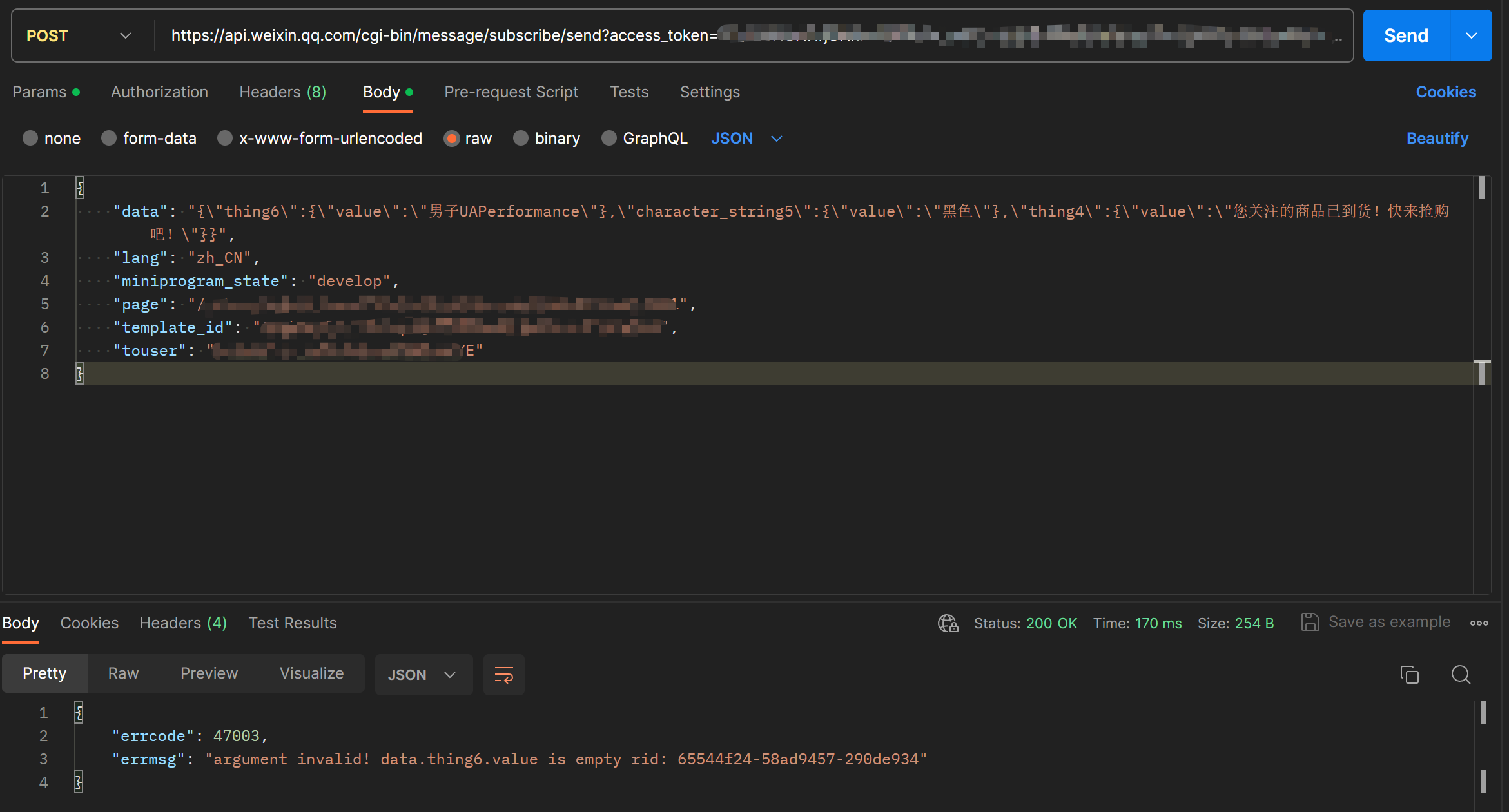 "data": "{\"thing6\":{\"value\":\"123\"},\"character_string5\":{\"value\":\"黑色\"},\"thing4\":{\"value\":\"您关注的商品已到货!快来抢购吧!\"}}",