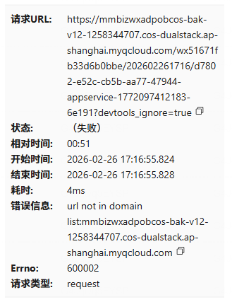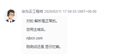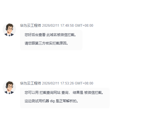 然后咨询了华为云的技术,对方反馈是被微信拦截的,所以问题不知道这种异常如何处理,目前华为云那边检查域名解析、服务器接口请求都是正常的,麻烦看下如何处理,这种问题出现概率10%左右。