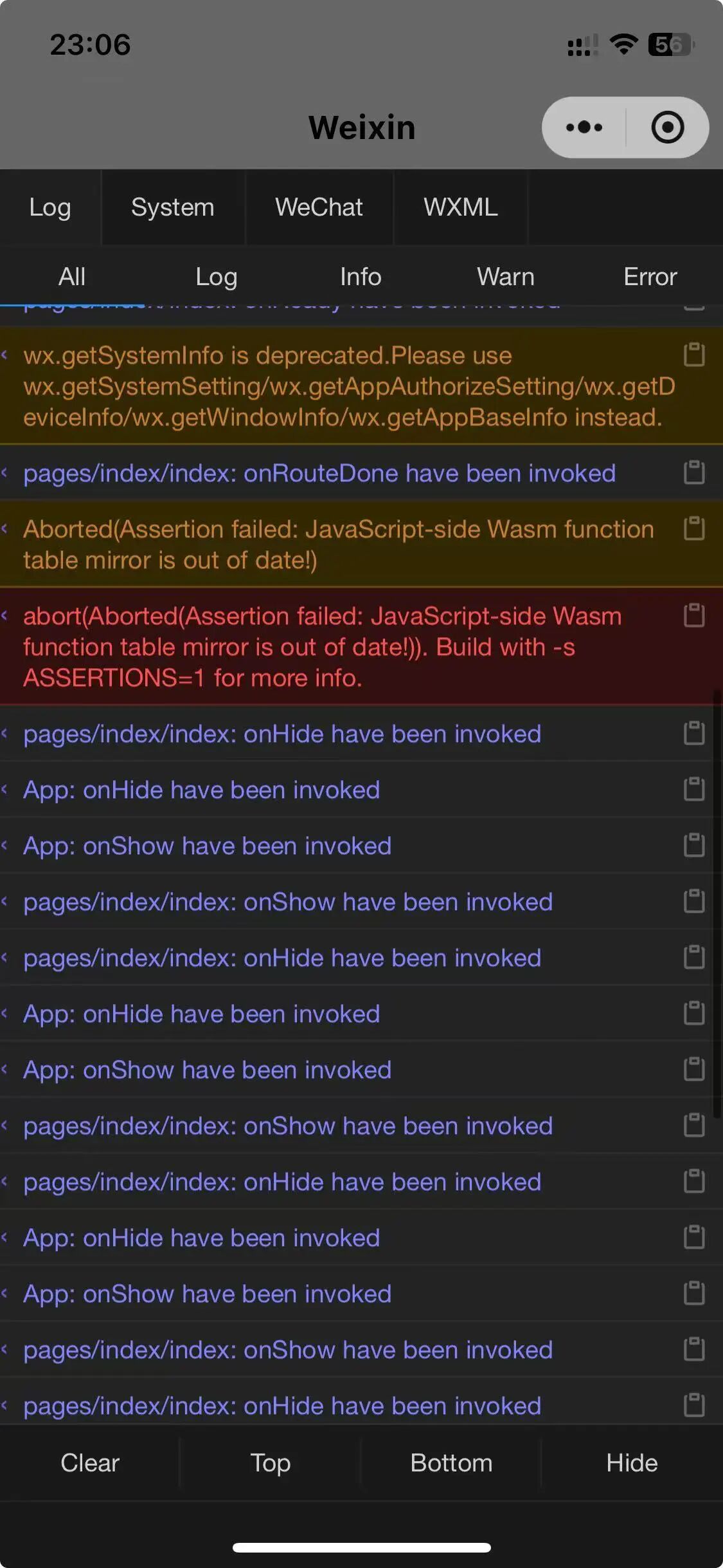 因为问题1迟迟未能解决,所以想当小程序处于iOS环境下,就在主线程中直接加载并实例化wasm模块,但完全一样的js胶水代码和wasm.br文件,还是在PC端iOS模拟器和Android真机上都运行正常,在iPhone真机上却无法正常进行实例化,这是因为js胶水代码修改的问题,还是什么其它问题呢?