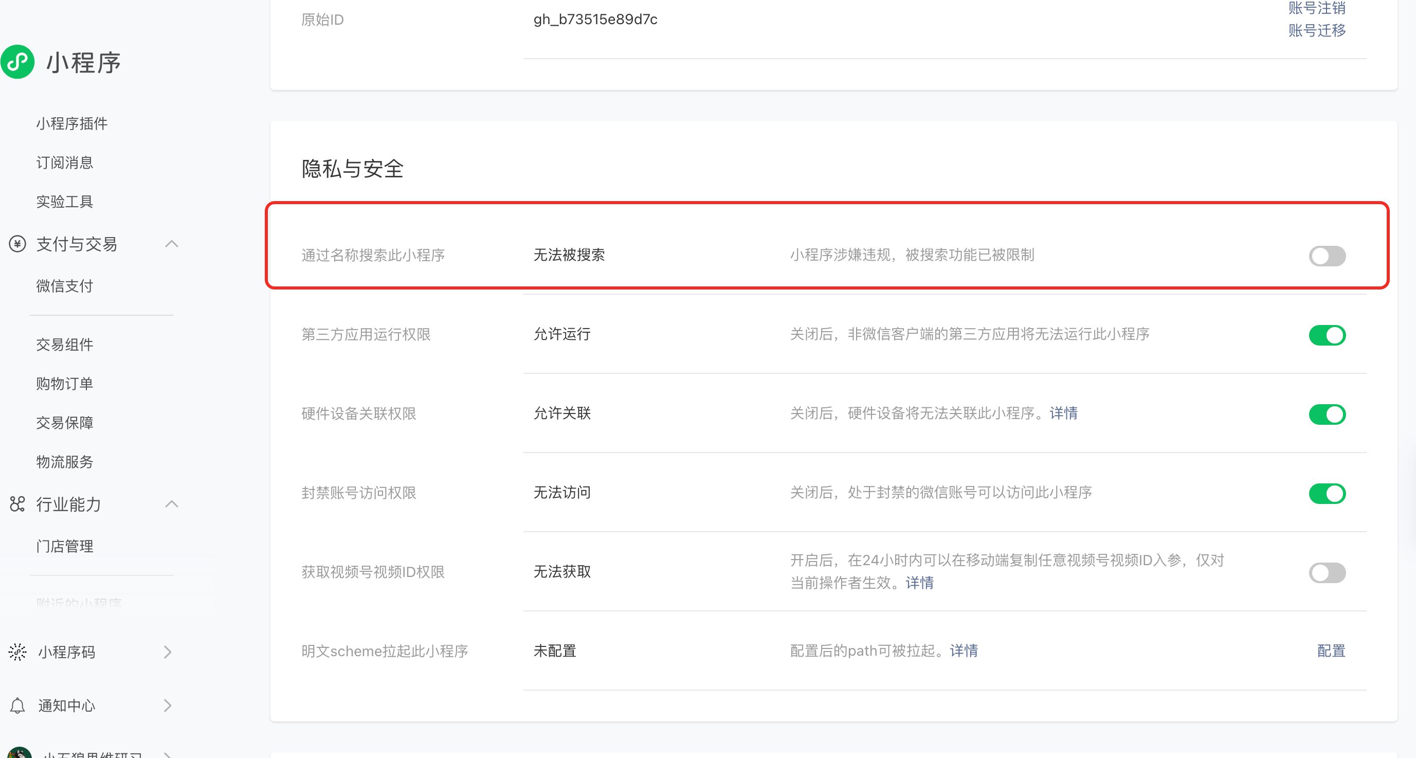 1、小程序AppID:wx15a42a48e2cd3d45(原始ID:gh_b73515e89d7c)无法打开被搜索的开关;(见截图)