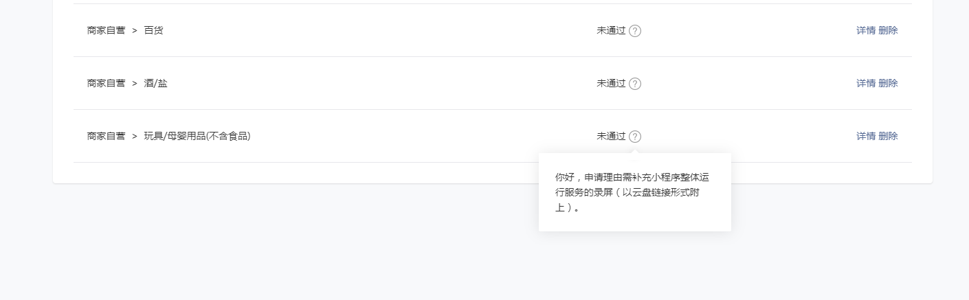 目前提交审核的服务类型有“百货”、“酒/盐”、“玩具/母婴用品”。