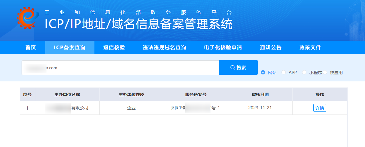 下面是网站的ICP备案信息查询,但是只备案了主域名,在小程序中配置的是一个子域名