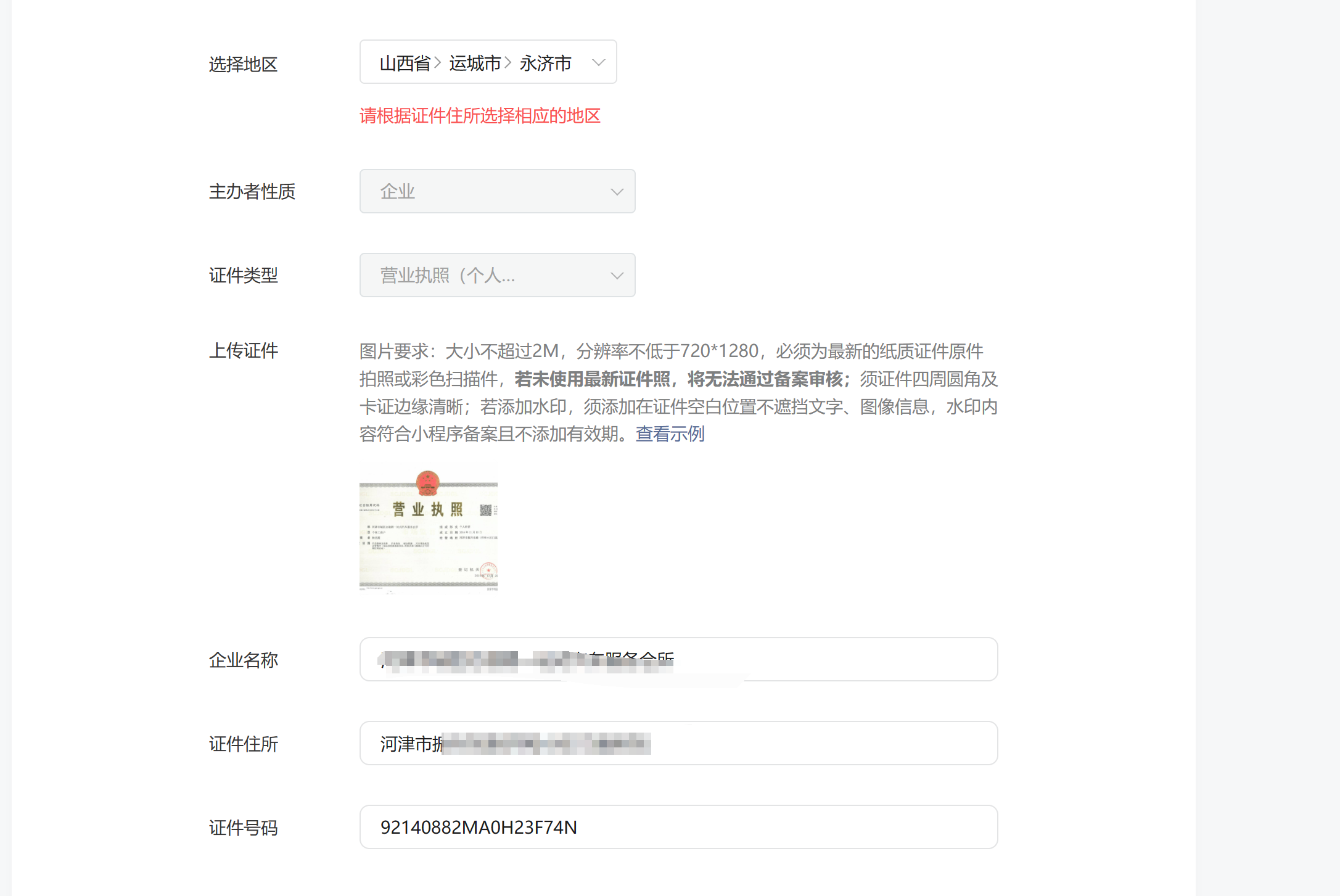 小程序年审请一直提示根据证件住所选择相应的地区怎么处理?