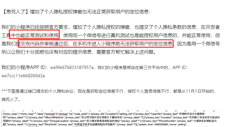 我们的小程序已经按照官方要求,增加了个人隐私授权的弹窗,也提交了个人隐私条款的信息,在开发者工具中也能正常测试和使用,使用同一个微信号进行真机测试也是能授权用户信息的,并能正常使用,但是我们提交完代码并审核通过后,在手机中进入小程序就无法获取用户的定位信息,因为是用一个微信号所以让我们十分困惑也没有对应的提示信息,需要官方帮忙解决上述问题。
