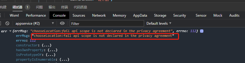 图3:今天在开发者工具中抛出的ChooseLocation的无隐私条款的抛错,让我十分无解,明明隐私协议中有的,今天开始在开发者工具中抛错了。