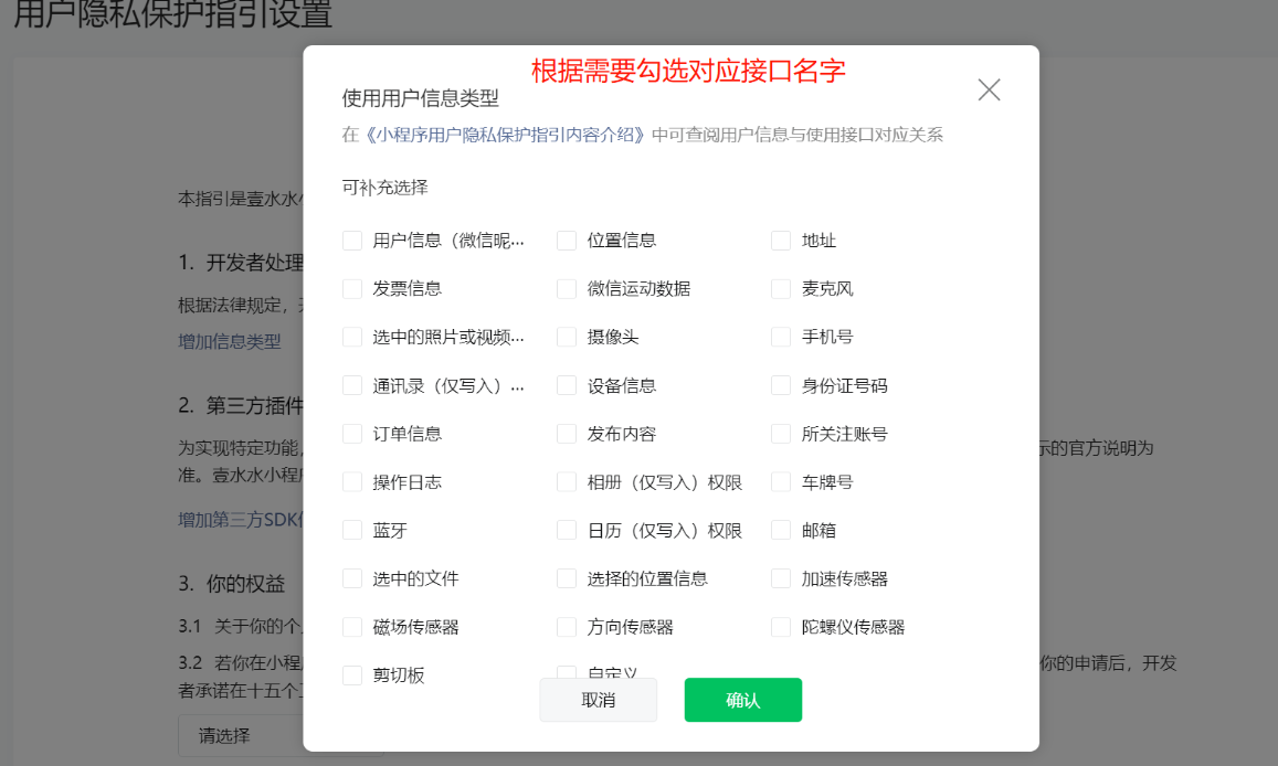 试试:在[mp后台 -> 设置 -> 服务内容声明 -> 用户隐私保护指引]中声明收集小程序所调用的接口/组件对应的隐私类型,勾选对应的接口,审核通过,一个小时后再试试